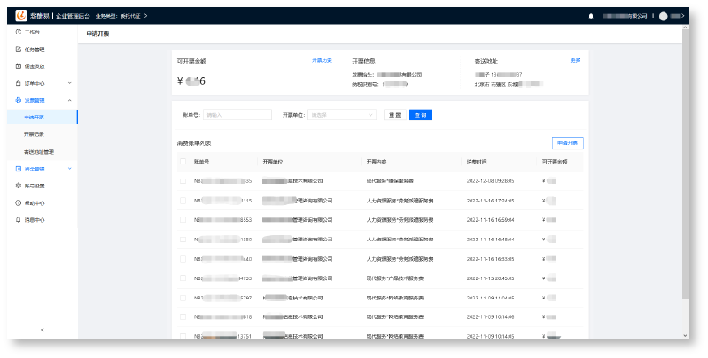 薪酬易为企业客户指定专属账户,余额流水实时监控,支持电子回单、发票凭证、在线申请一键直邮